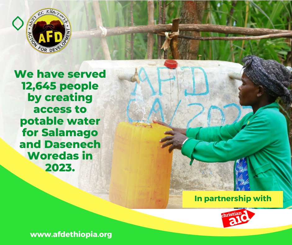 አክሽን ፎር ዴቨሎፕመንት በደቡብ ኢትዮጲያ ክልል በደቡብ ኦሞ ዞን የዳሰነች እና ሳላማጎ ወረዳዎች ለሚገኙ ከ12ሺ በላይ ነዋሪዎች የንጹህ መጠጥ ዉሀ እንዲያገኙ አስችሏል፡፡ ከክርስቲያን ኤይድ ጋር በመተባበር የተተገበረዉ ይህ ፕሮጀክት በሁለቱ ወረዳዎች ዉስጥ በድርቅ ለተጎዱ ነዋሪዎች የአደጋ ጊዜ ዉሀ አቅርቦት ተደራሽ ለማድረግ ያለመ ነዉ፡፡ በሁለቱ ወረዳዎች ዉስጥ የሚገኙ ተጋላጭ የማህበረሰብ ክፍሎች ከፍተኛ የዉሀ እጥረት የነበረባቸዉና ለዉሀ ወለድ በሽታዎች የሰፋ ተጋላጭነት የነበራቸዉ ናቸዉ፡፡